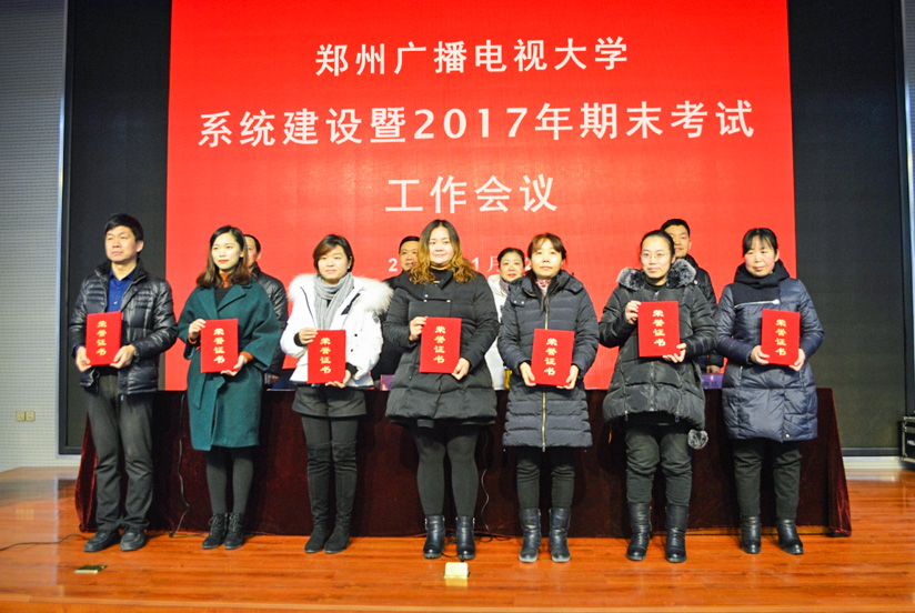 会上,王艳霞同志宣读了《郑州广播电视大学关于表彰2017年度教务工作先进单位、招生工作先进单位、优秀管理工作者和优秀导学教师的通报》,并为获奖集体和个人进行了颁奖。尚德基同志传达了河南电大“全省电大系统工程建设工作会议”和“2017年秋季学期考试工作会议”精神。刘俊霞同志就2017年期末考试的具体工作进行了安排布置。